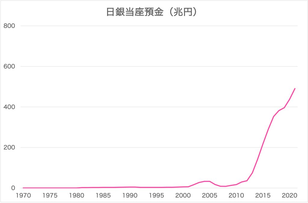 2012年から2021年現在までで、日銀当座預金は485兆円増加しています。