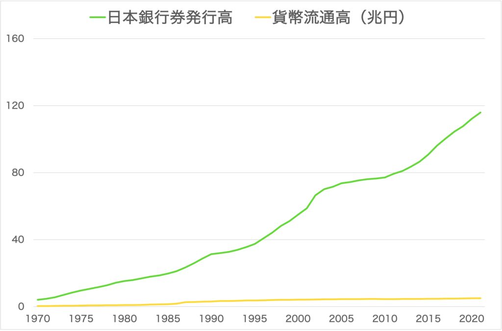 お札(日本銀行発行券)と小銭(硬貨)の増加量